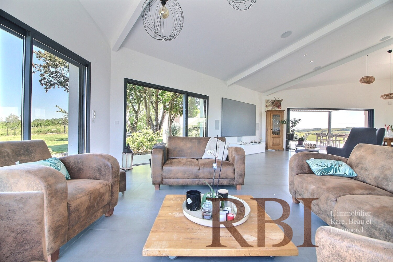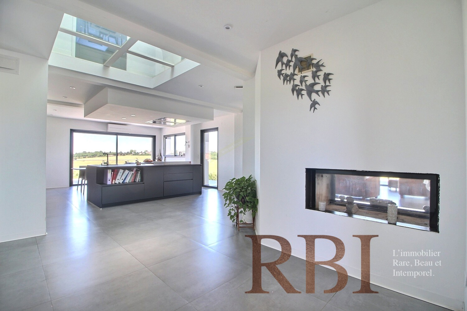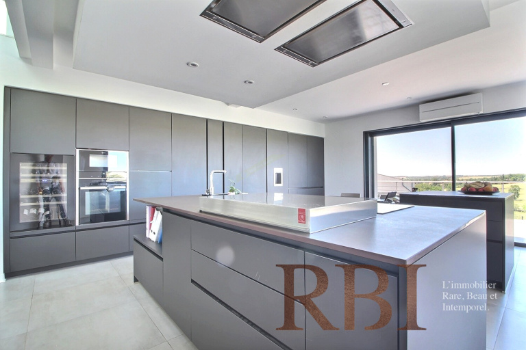 La maison principale, en classe énergétique A, développe environ 265m² habitables dont 180m² de plain-pied. Dès l’entrée, on découvre un espace lumineux et harmonieux. Le hall dessert un espace de vie de plus de 125m² comprenant un séjour cathédrale avec cheminée/insert, un espace repas et une cuisine contemporaine sublimement épurée et hautement équipée conçue récemment par une cuisiniste. De grandes ouvertures traversantes offrent une luminosité remarquable et un lien direct avec les extérieurs.